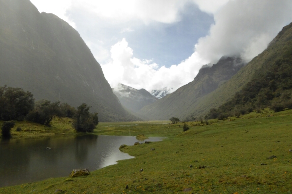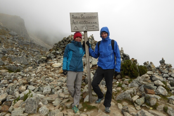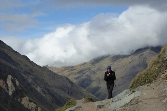 Heureusement, le Salkantay au dessus de nos têtes donne des ailes aux plus lourds d'entre nous et nous profitons tout de même d'un paysage incroyable avant de plonger dans un nuage épais au sommet de col nous cachant toute vue sur le clou de la journée. Les deux heures de descente jusqu'au déjeuner (préparé par le chef Selso) se font sous la pluie et dans un bon rythme, nous obligeant à attendre dans le froid les derniers pendant 1h30 avec comme apéro tout de même le maté de coca!