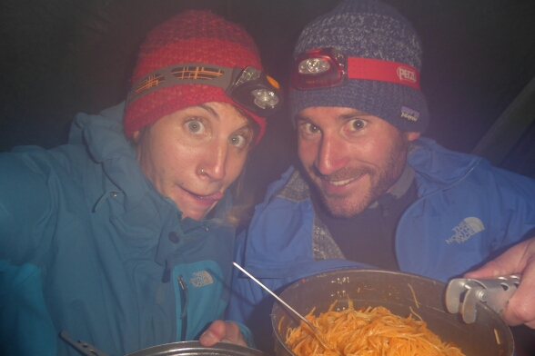En attendant, malgrés les efforts pour eviter les flaques et les coulées de boue, nous avons les pieds trempées, en fait, nous n' aurons les pieds secs que dans les sacs de couchages pendant tout le trek. Nous avons juste le temps de monter la tente et de nous y réfugier avant que le déluge ne reprenne. A la première acalmie, nous deploierons tout notre courage pour allez cuisiner une fois la nuit tombée. Jamais des pâtes à la sauce tomate n'eurent été aussi divines.
