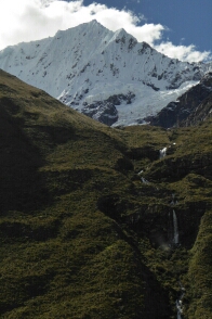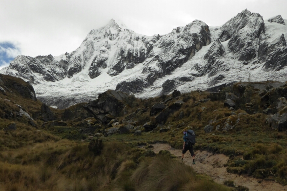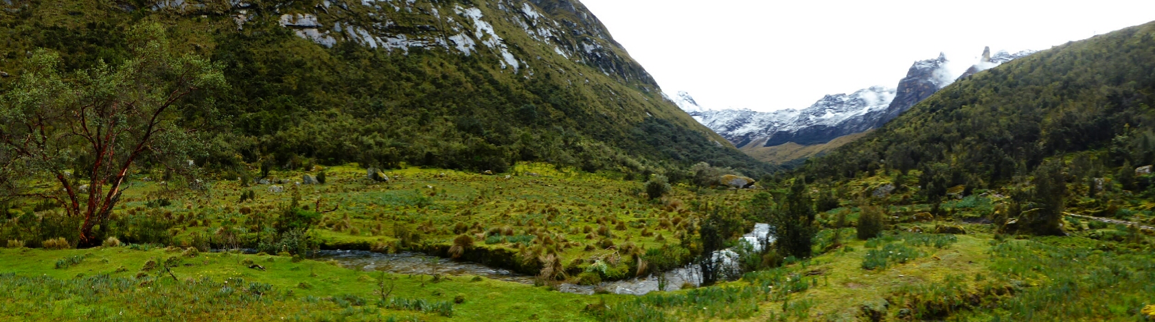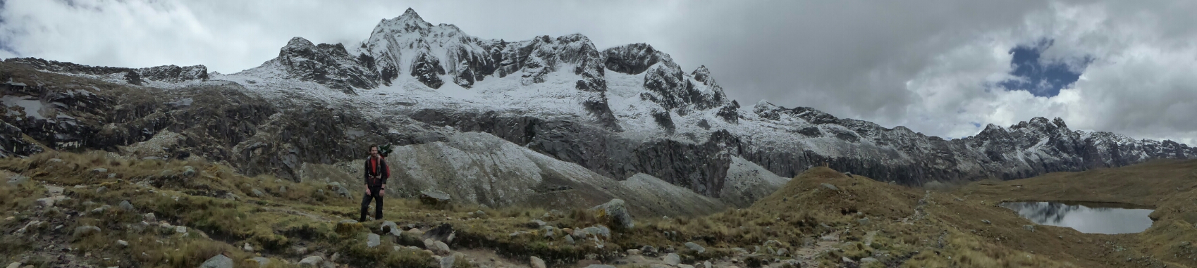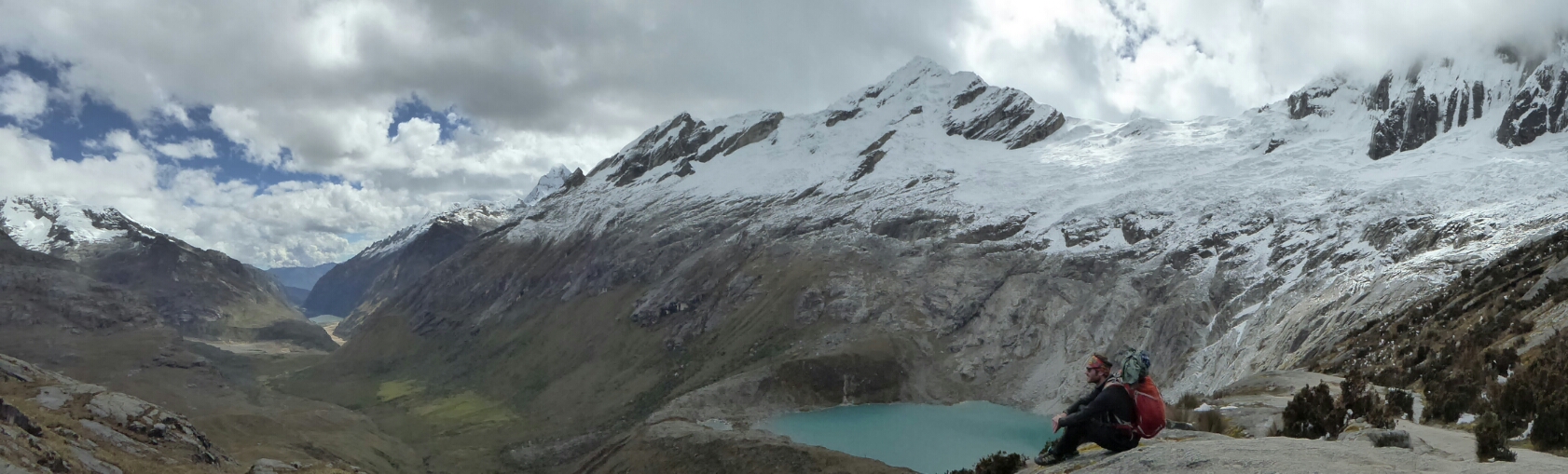 Après une longue montée face à une barre rocheuse qui ne laisse rien entrevoir de ce qu'il y a derrière, nous franchissont le col qui nous dévoile alors sous un soleil radieux les plus hauts et les plus beaux sommets de la cordillère blanche. Après avoir été les trekkeurs les plus chanceux de patagonie, nous sommes desormais les plus chanceux de la cordillère blanche. Le spectacle est hallucinant et nous comprenons les flateries sur le compte de ces montagnes. Les pics enneigés nous entourent dont l'Artesonraju, la célèbre montagne de la Paramount!