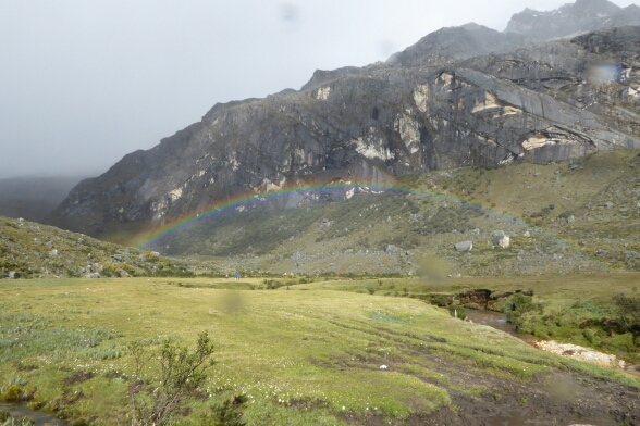 Après une heure de farniente sous le soleil et devant toute cette beauté, nous redescendons ... sous la grêle puis sous la pluie jusqu'à notre deuxième campement mais on s'en fiche, notre tête est restée là-haut et nous traversons les arcs en ciel le cœur léger.